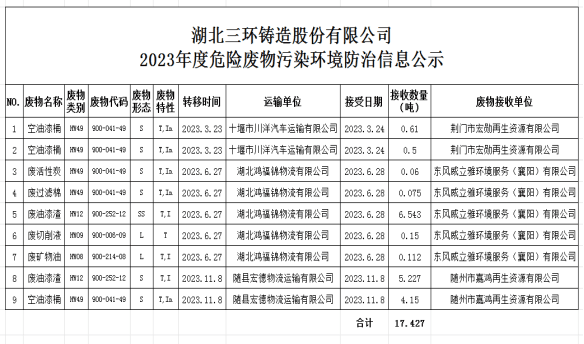 根據(jù)相關(guān)法律法規(guī)和上級管理部門的要求,產(chǎn)廢單位需每年將本單位危險廢物污染環(huán)境防治信息進(jìn)行公示,現(xiàn)將湖北三環(huán)鑄造股份有限公司2023年度危險廢物污染環(huán)境防治信息公示如下: