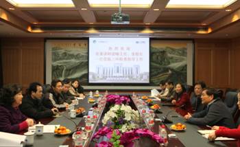 圖2:省委講師團主任喻立平(左二)主持召開座談會 為進一步加強理論武裝工作,1月15日上午,省委宣傳部、省委講師團、省國資委等部門領導一行11人蒞臨三環(huán)集團公司,舉行了“湖北省理論熱點面對面示范點”授牌儀式并進行調研座談。省政協(xié)文史與學習委員會副主任彭明,公司總經(jīng)理梅漢生、黨委副書記景小清、總經(jīng)理助理聶濤等參加了授牌及調研活動。三環(huán)集團公司是省委宣傳部、省委講師團確定的全省15個示范點之一,也是入選的唯一一家國有企業(yè),與武漢工程大學開展聯(lián)系共建。